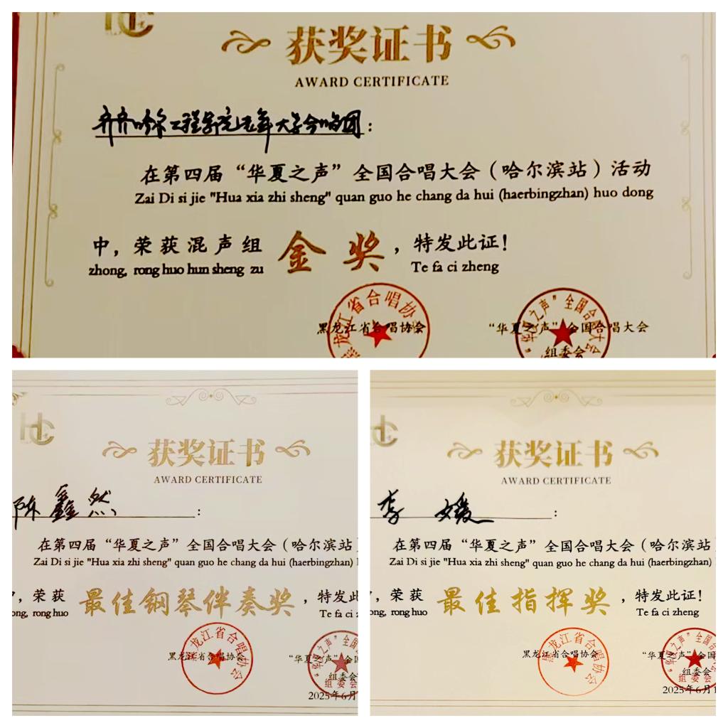 近日,学校老年大学合唱团在第四届“华夏之声”全国合唱大会上,凭借优异表现,夺得混声组“金奖”,指挥李媛、钢琴伴奏陈鑫然分获“最佳指挥奖”与“最佳钢琴伴奏奖”,实现奖项数“大满贯”。