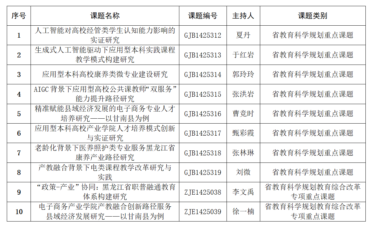 今年上半年,学校科研处认真把握《教育强国建设规划纲要(2024-2035 年)》和全国、全省教育大会对教育事业提出的新要求,根据黑龙江省教育科学规划领导小组课题立项通知,深入开展了2025年度课题立项申报工作,经本人申请、各部门推荐、学校遴选之后,最终推荐上报省级重点课题11项。在课题培育和申报过程中,科研处有针对性地进行了多次课题立项指导,有效保证了课题申报材料质量,为Beat365本年度获批省级重点课题10项之多奠定了基础。