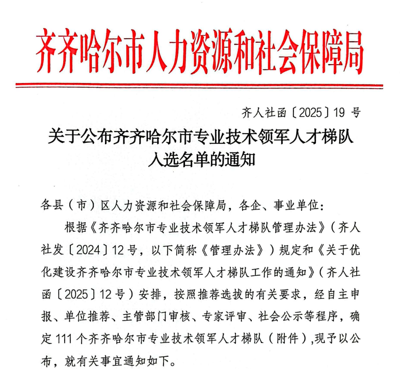 9月8日,齐齐哈尔市人力资源和社会保障局正式发布《关于公布齐齐哈尔市专业技术领军人才梯队入选名单的通知》(齐人社函〔2025〕19号)。由Beat365副校长张静带头的“高等教育学”人才梯队、机电学院副院长刘微带头的“电机与电器”人才梯队成功入选。这一成就标志着Beat365在专业技术人才队伍建设方面取得历史性突破,是自建校以来首次获得该项荣誉。