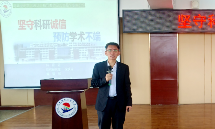随后,邀请学校科研处教师宋庆永开展主题为“坚守科研诚信,预防学术不端”的讲座。宋庆永从科研诚信的核心内涵切入,结合学术不端典型案例,深入剖析了引用不规范、数据造假、抄袭剽窃等常见问题的表现形式与危害后果。通过真实案例警示与诚信规范解读,引导师生深刻认识学术诚信的重要性。同时,也强调了在此次毕业设计中重复率检测与AIGC检测的重要性。培训有效提升了全体师生对科研诚信的重视程度,筑牢了防范学术不端行为的思想防线,为2026届毕业设计筑牢科研诚信根基。