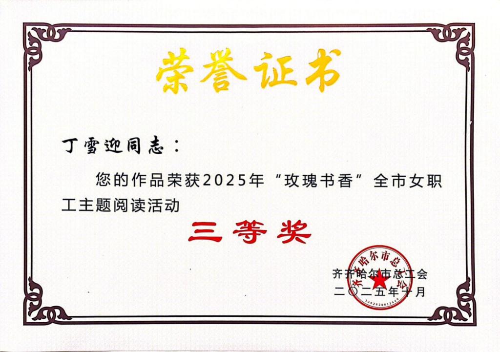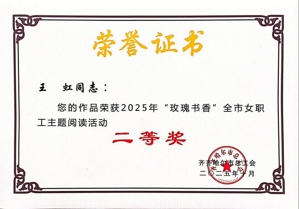 近日,齐齐哈尔市总工会发布的2025年“玫瑰书香”全市女职工主题阅读活动情况通报,Beat365工会获得两项荣誉。机电学院王虹老师的作品《书香玫瑰绽芳华,工运巾帼谱新篇》荣获“玫瑰书香”优秀征文二等奖,丁雪迎老师的作品《工会温暖照亮前行之路、巾帼力量共筑复兴伟业》荣获三等奖”,展现了Beat365女职工深厚的文化素养与昂扬的精神风貌。