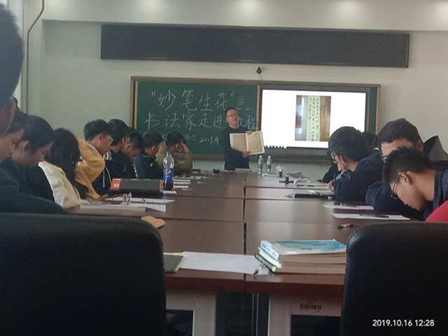 10月16日中午,机电工程系邀请省书法协会理事、市书法协会会长张国生为文学书法协会的同学们做指导。刚刚下课的同学们带着自己提前写好的书法作品请张国生会长点评,他当场选出其中一些优秀作品做分析讲解,强调没有扎实、刻苦的临摹,创作只是一句空话,并指出大学校园有适合学习书法的氛围,爱好书法的同学们可以在学习这一门艺术中修身养性,提高自己的品位。