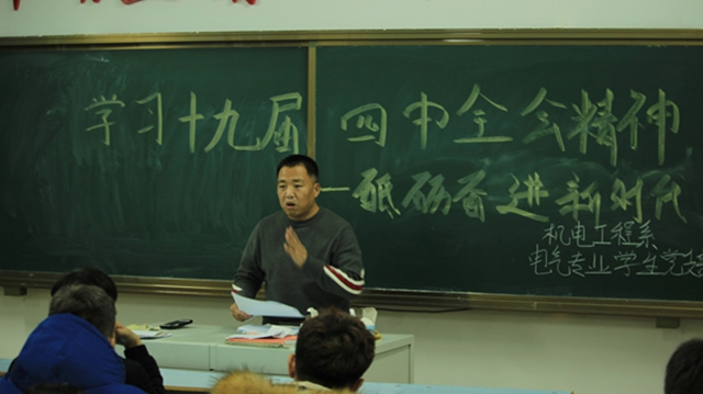 11月27日下午,电气专业学生党支部组织全体党员及发展对象共同学习党的十九届四中全会精神。支部书记王连俊为大家梳理了党的十九届四中全会审议通过了《中共中央关于坚持和完善中国特色社会主义制度、推进国家治理体系和治理能力现代化若干重大问题的决定》等主要内容,同时传达学院党委对各系党组织下一步开展主题教育的相关要求,对支部下一步主题教育工作做出安排。