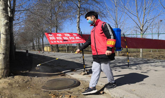 土木183班团员王浩茗在河北省石家庄市正定县北早现乡安谷村做疫情防控志愿者,负责居民进出登记工作和参加村里消毒工作。