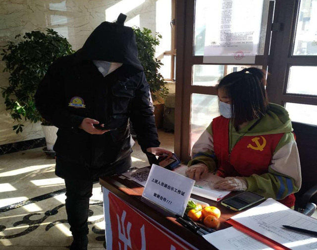 土木192班团员李珊在齐齐哈尔市克东县做疫情防控志愿者,在小区卡点为居民登记测量体温,并发放居民通行证,每天工作时间达5个小时。