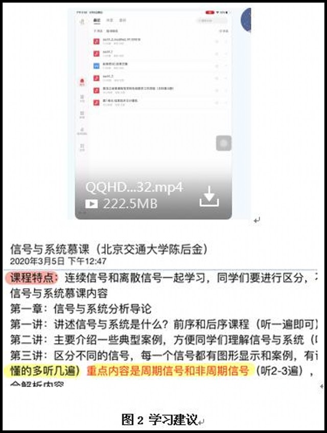 《信号与系统》课程,是一门学科基础课程,理论性比较强,学生在线学习难免会遇到诸多困难。那么,应该采取什么样的在线教学手段,才能保证学生在线学习效果呢?我为此学习了在线教学培训课程,还去大型学习平台观看了解其他高校的教学平台情况以及学生的学习心得体会,最终选用了中国大学慕课、慕课堂、QQ群信息化平台,实施所任教的《信号与系统》在线教学工作——