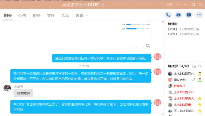 学校线上开课后,基础部语文教师王春凤借助学习通和QQ群平台,本着课程服务于专业培养目标、服务于学生成长的目的,对任教班级进行学情分析,在了解专业和学生特点的基础上,对《大学语文》在线教学流程进行了精心设计,努力营造一种学生乐学的学习氛围。——