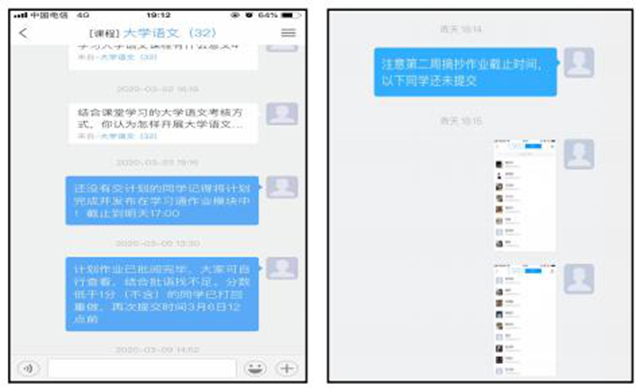 在线教学平台百花齐放,各有千秋,综合运用可以取其长处优化教学。我根据《大学语文》的学科特点和教学内容,对模块一“口语交际”主要采用腾讯会议+学习通+QQ 的形式进行“面对面”授课,在此过程中要求学生端打开视频,教师可随时翻动屏幕页面关注学生语言表达实际状态;模块二“经典诵读”转用钉钉+学习通+QQ 的形式进行直播授课,录播功能方便学生随时回看学习重难点。期间,伴随使用学习通进行师生互动,同时运用 QQ 联系由于网络原因无法及时参与学习通互动的学生,尽量保证教学全覆盖。