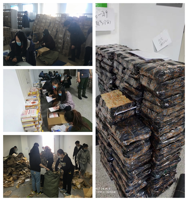 随着在学校线教学的不断深入,学生对纸质版教材的需求愈加强烈。为提高学生居家在线上课学习效率和效果,学校急学生所需,积极组织力量为学生寄送纸质教材。4月27-30日,由教务处牵头,学工处、财务处、资产管理处统筹,各部门全力配合,高效完成了学生纸质教材及学习资料的搬运、分拣、打包和邮寄工作,共为2017级、2018级、2019级学生分发纸质教材4700多套。