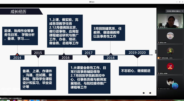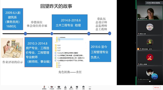 6月17日下午,建筑工程系在线召开成长故事分享会,专业长张好徽、李智慧、宋兴蕾,专业教师李俊、姜力力、潘娜交流分享个人成长故事。系教学工作副主任徐明主持活动。