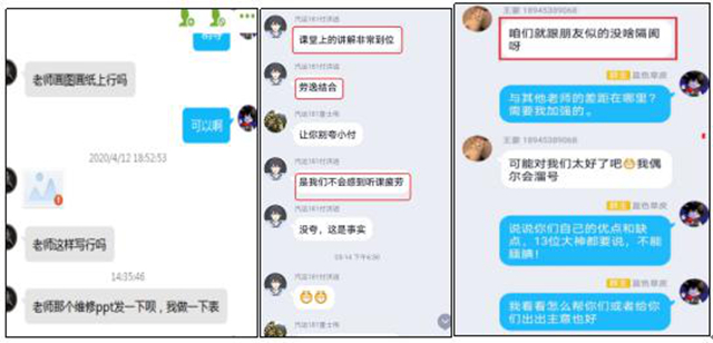 线上教学环节的每一步都设有相应的分数,让学生明白全程参与教学过程对自己的课程合格与否有着很大的影响,而并不是教师单纯以考试方式来确定学生是否能够通过课程评估。教学评价环节中重视过程评价,关注学生的素养,多层次评价,采用“结果与过程结合、技能与素养结合、自评与他评结合”的方式,评价其过程、结果和基本职业素养。本学期的在线教学已完成了14周的教学任务,从上课初期到目前为止,学生学习状况有了很大的变化,例如学生从被动发言到打断授课过程直接提问,从服从性听课到主动提出自己的想法,从零沟通到课下约老师交流。另外,通过督导听课和学生评价,授课过程得到了认可。