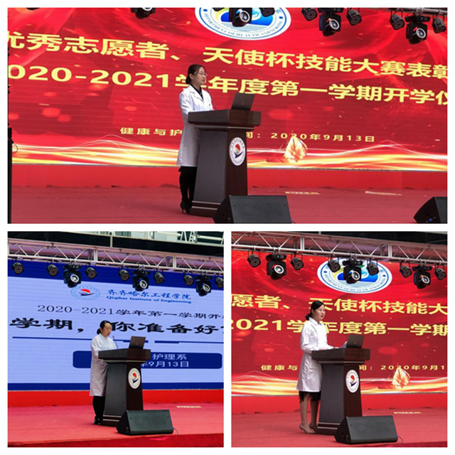 9月13日,健康与护理系召开防疫优秀志愿者、“天使杯”技能大赛表彰大会暨2020-2021学年度第一学期开学仪式。系主任张静,系学生工作副主任王丽萍、系教学工作副主任张苗与各专业长、专业教师和全体辅导员及全体学生参加大会,护理学185班王双菊同学主持大会。