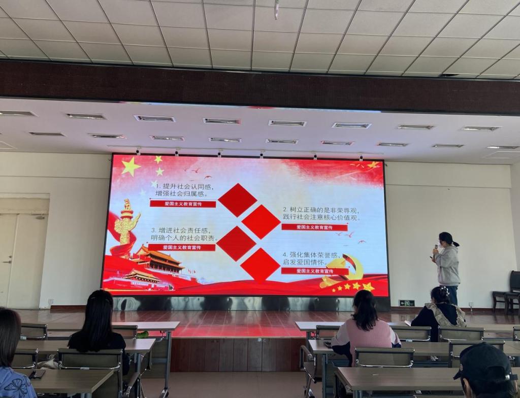 信息工程系刘阳老师讲述了爱国主义教育的意义,她表示,弘扬爱国主义精神,不仅能树立正确的三观,提升社会认同感,增强社会归属感,明确个人的社会职责,还能强化集体荣誉感,激发爱国情怀。刘老师播放了阅兵视频,向同学们提出倡议,希望同学们能够参军入伍,用热血书写青春,保卫祖国。