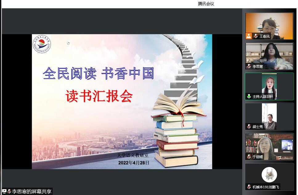 4月28日,大学语文教研室线上举办以“全民阅读 书香中国”为主题的第十一届校园读书节系列活动之读书汇报大赛。校宣传部副部长王倩、校语委办胡士秀、大学语文全体教师、全体参赛选手及近200名学生代表参加,求索文学社聂羽轩担任主持。本次大赛,旨在用经典阅读点亮学生心灵,内外兼修提升学生素养。