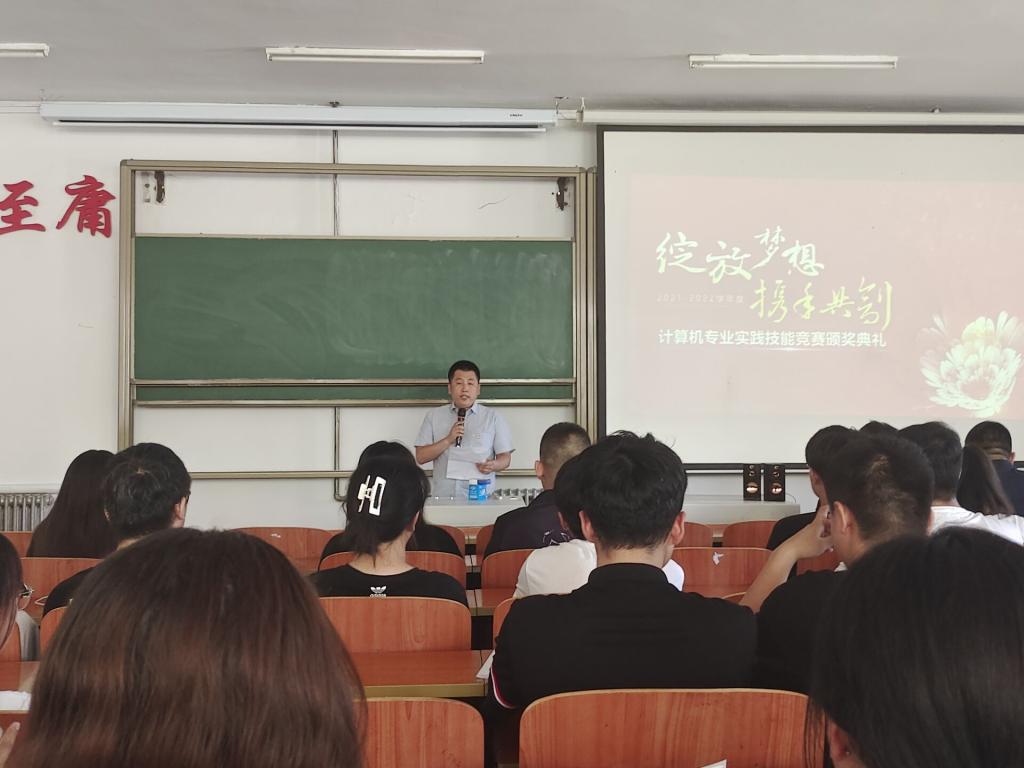 为推进专业实践学期实习,促进学生专业学习和实践能力提升,营造浓厚的科技创新氛围,7月27日下午,计算机科学与技术专业在一号教学区1101阶梯教室召开专业实践技能竞赛颁奖会。信息工程系教学工作副主任李野、计算机科学与技术专业负责人、专业实践学期指导教师、计算机科学与技术专业生涯导师和该专业学生参会,部分师生通过腾讯会议线上同步参加。