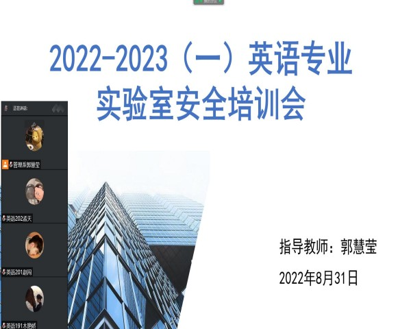 8月31日晚,英语专业郭慧莹教师通过腾讯会议的方式组织召开实验(训)安全教育及实训准入考核培训,英语专业教师郭慧莹主持,英语专业全体学生参加了本次培训。
