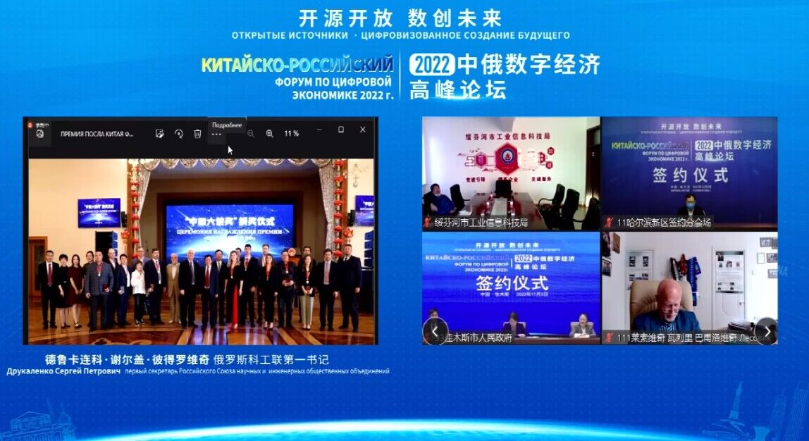 2022年“中俄数字经济高峰论坛”在北京、哈尔滨、俄罗斯莫斯科等多地同步开幕。论坛主题为“开源开放、数创未来”。