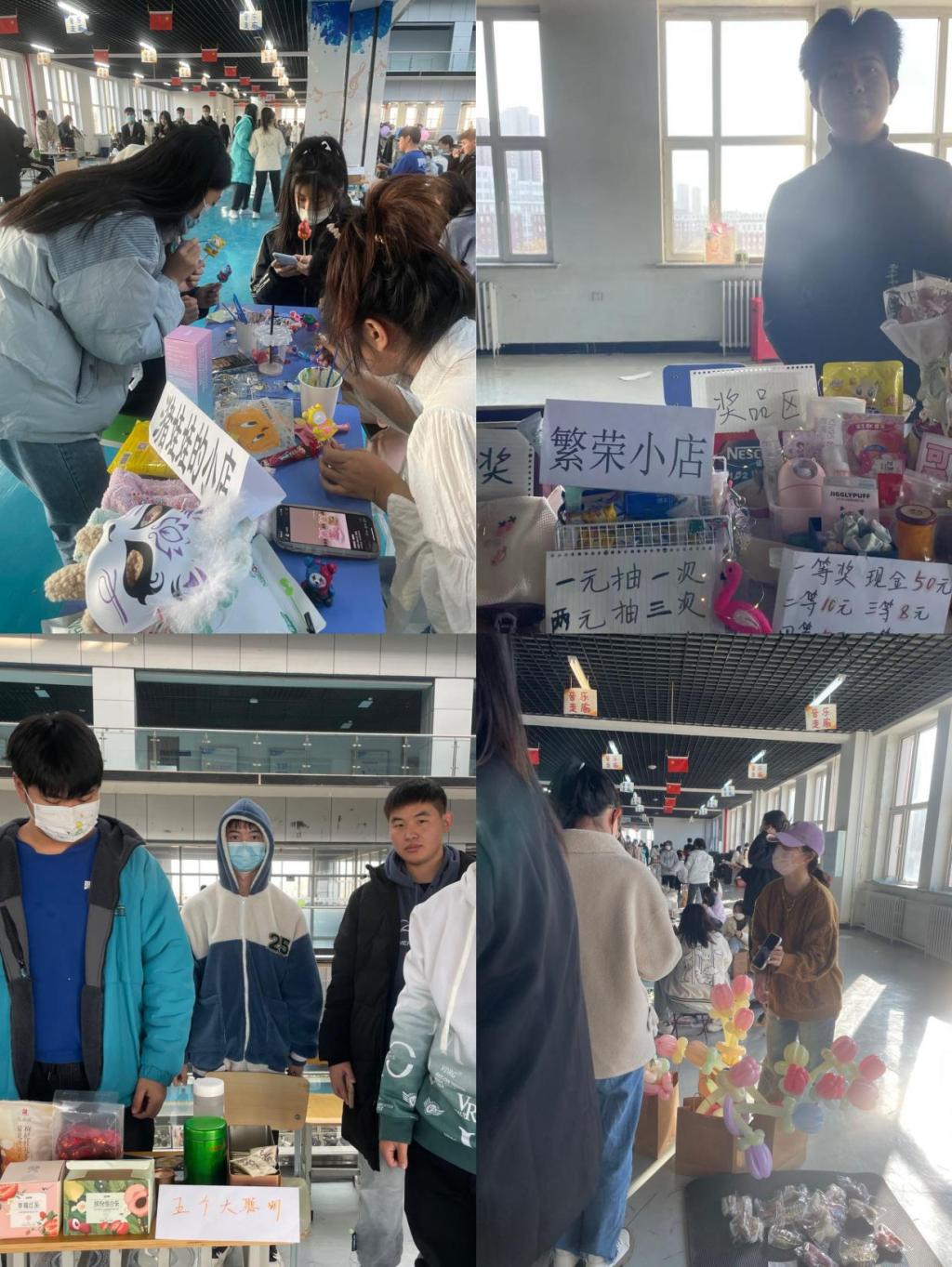 交易现场,每个店铺都有自己的特色,琳琅满目的商品吸引了学生的驻足。整个会场充满了欢笑声、音乐声。