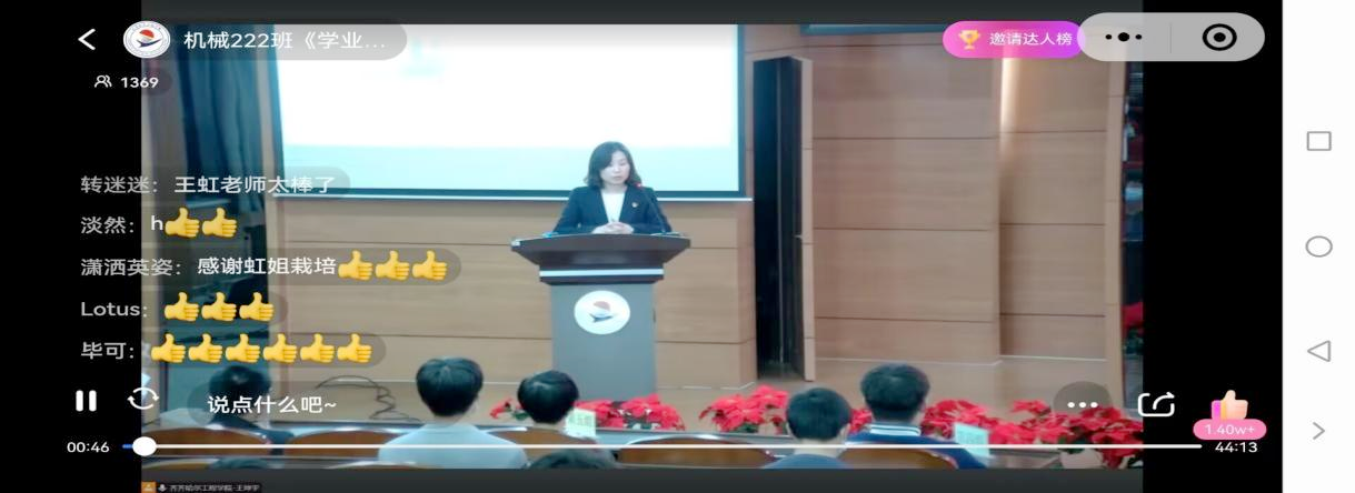 11月17日晚,机电工程系机械222班“学业规划”主题班会在图书馆601举行,副院长张振笋,各系学生工作副主任、全体辅导员及学长现场参加,学生家长、生涯导师及校友等1800余人在线观看。