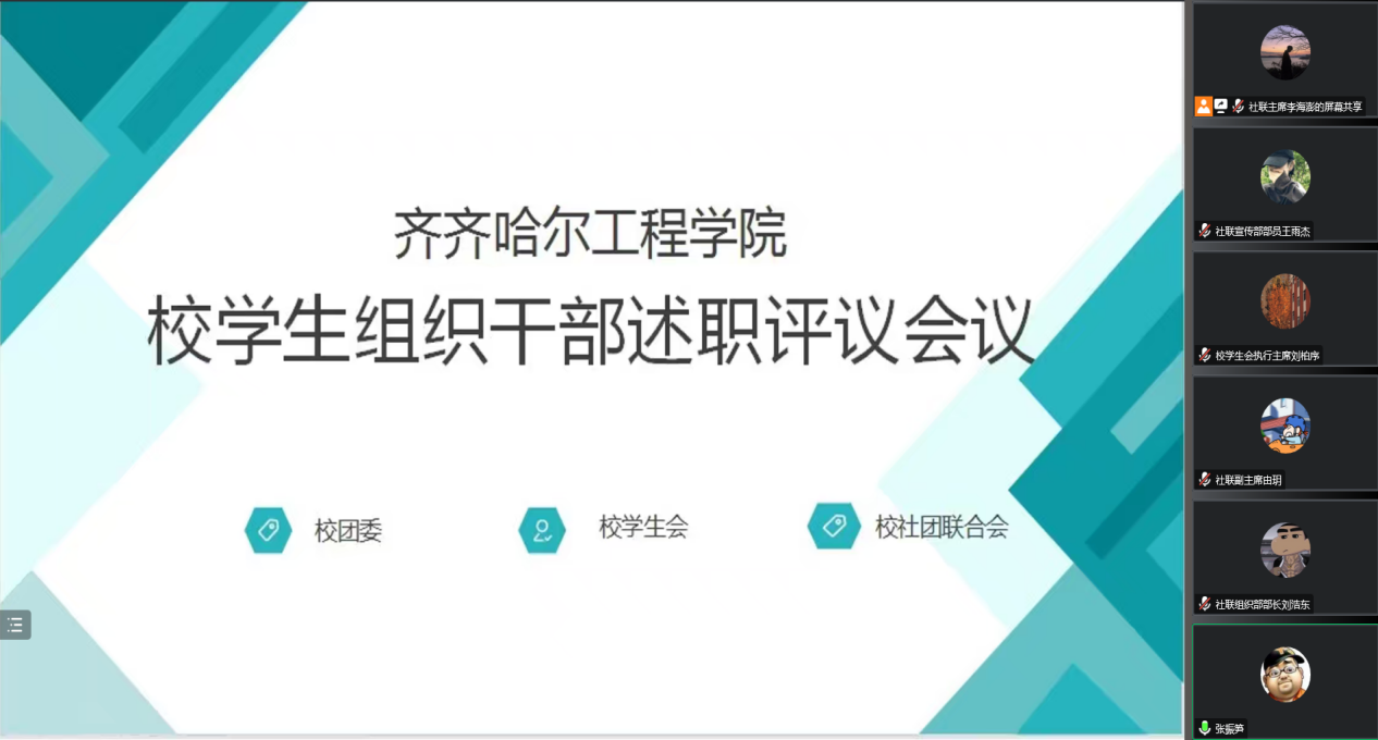 为深入贯彻落实高校学生组织深化改革的要求,完善Beat365各级学生组织工作,总结2022—2023学年度第一学期校学生组织干部工作经验,1月9日晚,学校在线召开校级学生组织干部述职评议会,副院长张振笋、团委书记郭明敬、团委指导教师张云惠、王睿及校组织学生干部参加,会议由校学生社团联合会副主席由玥主持。