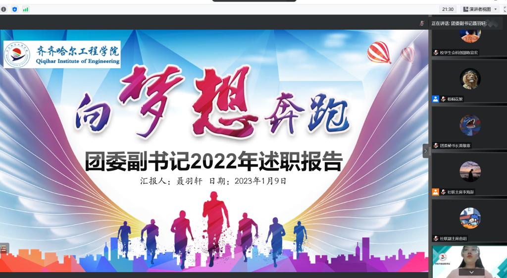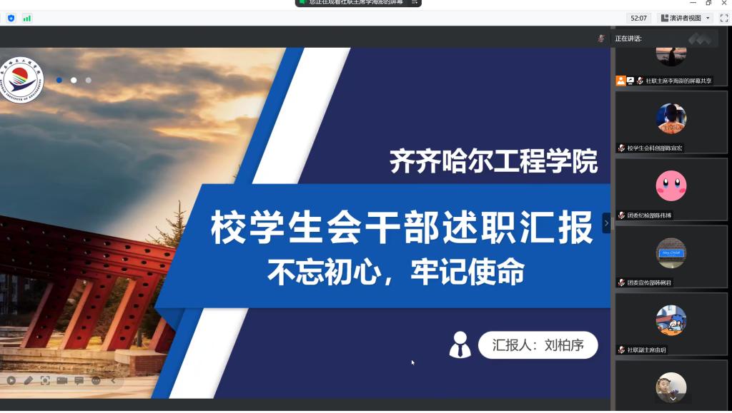 会上,团委、学生会、社团联合会学生干部共计23人,以PPT形式进行述职报告。报告围绕学习情况、工作作风、工作成果、经验反思、工作计划等方面,阐述学生工作亮点、工作不足以及改进措施,并对下学期的工作进行规划。