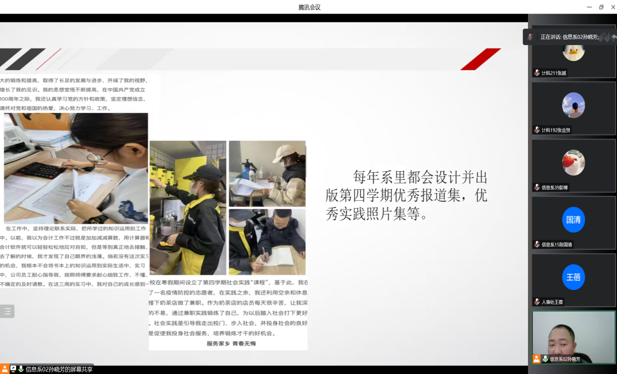 首先,孙晓芳介绍了第四学期,以及第四学期分为必修类、选修类和通识类的内容,强调指导教师起到关键性作用,今年学生党员干部参与进来配合指导教师工作,大大促进了第四学期的顺利开展。