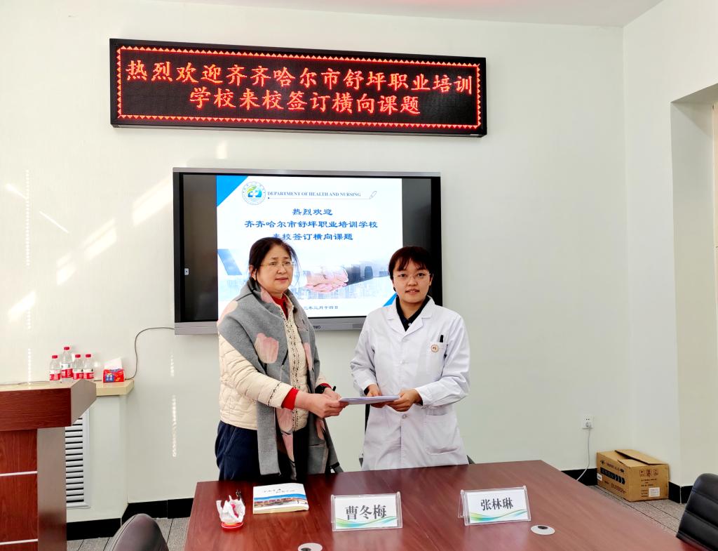 3月14日下午,健康与护理系在一号教学区2104会议室与齐齐哈尔市舒坪职业培训学校签订技术服务型横向课题合同。双方就“社区养老护理人员职业能力提升”课题进行研究。该培训学校法人曹冬梅、健康与护理系教学副主任张林琳、大健康实践教学中心主任张晓波、护理学专业骨干教师金璐、李岩等参加。