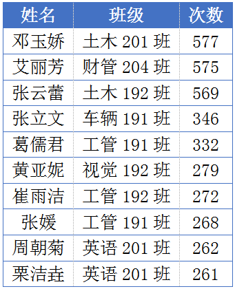 建筑工程系土木201班的邓玉娇,以577次入馆数据,荣登2022年度阅览达人榜首;管理工程系财管204班的艾丽芳,以两次之差居第二位;建筑工程系土木192班的张云蕾,以569次入馆数据获第三名。从数据中不难看出,单丝不成线,孤木不成林,阅览达人中2020级与2019级的比例是2:3,而班级排行榜中2020级的班级只占1/5,2019级班级占有4/5。值得一提的是工管2019级所有班级进入班级榜前三,工管2019级整体的学习氛围非常好。学习不是一朝一夕的事,良好的阅读习惯伴随学生的一生,工管2019级喜欢扎推在图书馆学习的现象是从入学持续到现在。