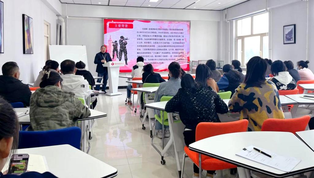 孙晓芳副主任介绍了征兵的主要背景和当兵各项优惠政策、新兵交接方式的新规定、遵循的基本原则以及经济收入、对兵员征集对象新的规定、征兵组织实施程序的方法和成长发展,并强调老师要正向引导学生,让学生认识到学习的重要性,让学生尽早制订目标,同时提醒老师要对已经参军的学生多关注,常联系。