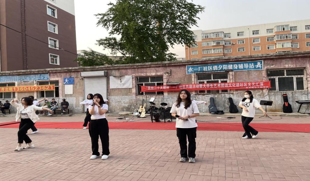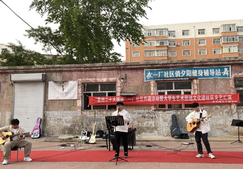 5月18日晚,由学校基础部美育教研室主办的“贯彻二十大精神”一厂社区共建活动暨大学生艺术团送文化进社区文艺汇演在一厂社区举行,旨在加强区校之间文化交流,更好地推动大学生文艺服务社区。40名文艺志愿者来到龙沙区一厂社区,为居民呈现了一场精彩的文艺演出。