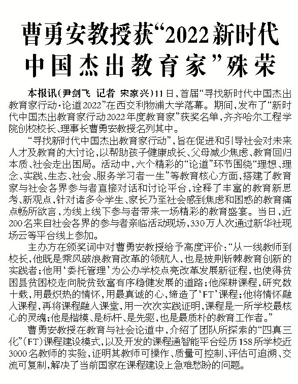 齐齐哈尔日报:曹勇安教授获“2022新时代中国杰出教育家”殊荣