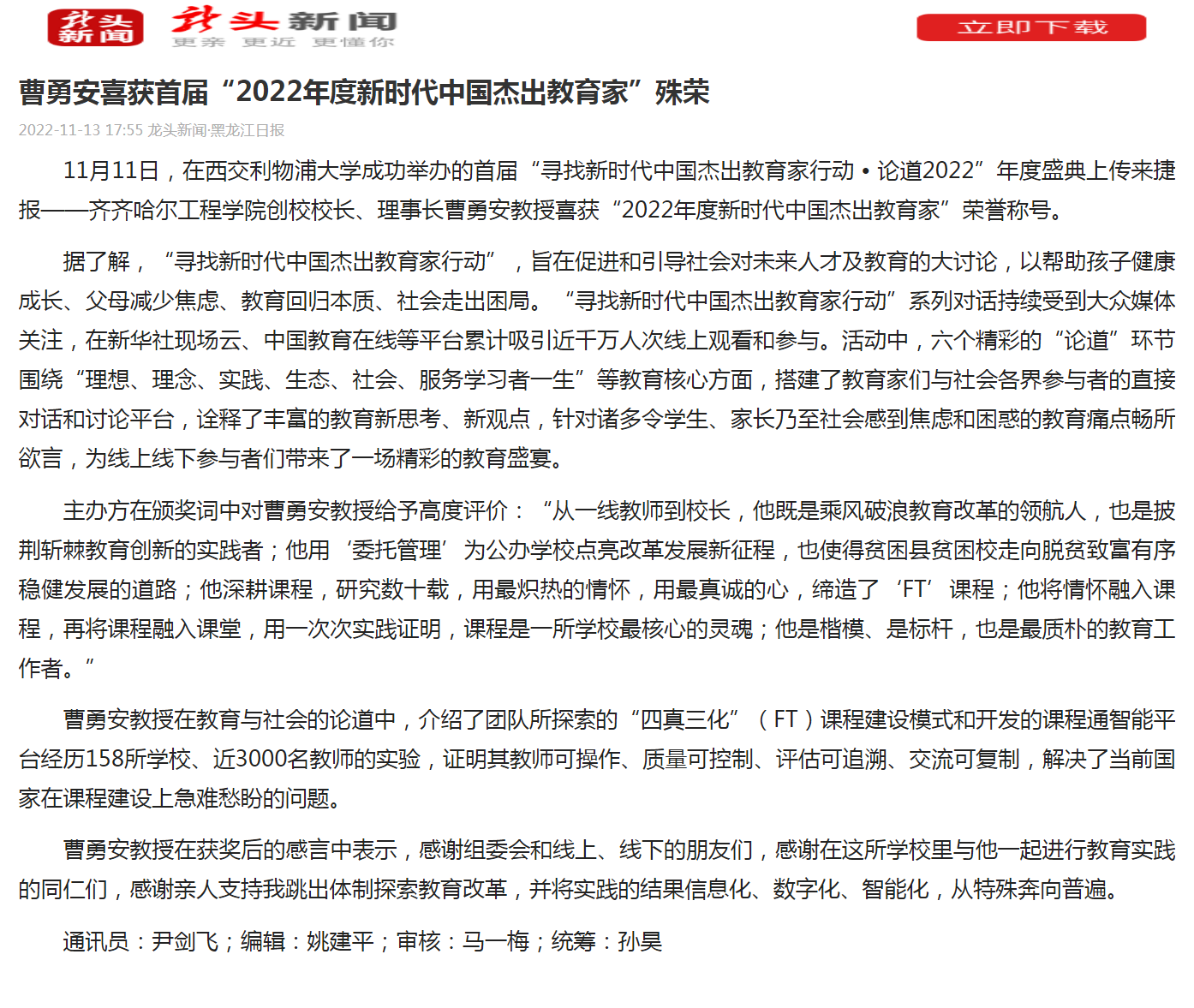 龙头新闻:曹勇安喜获首届“2022年度新时代中国杰出教育家”殊荣