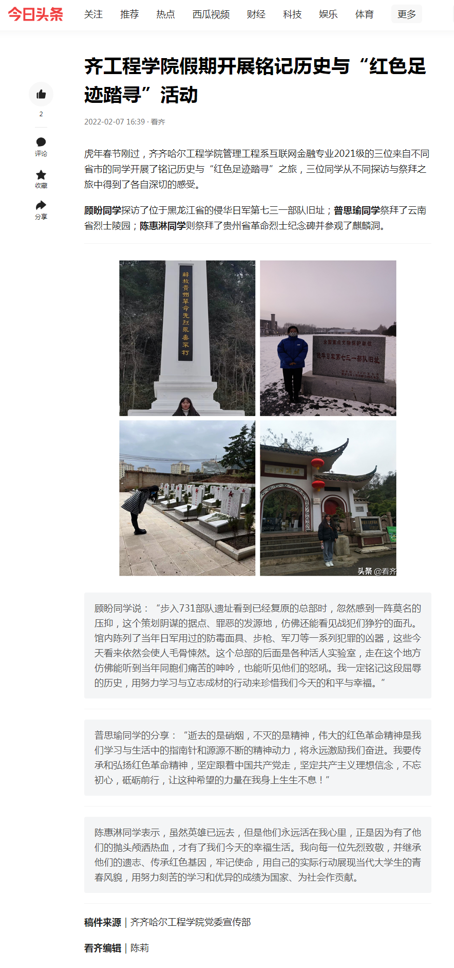 今日头条:齐工程学院假期开展铭记历史与“红色足迹踏寻”活动