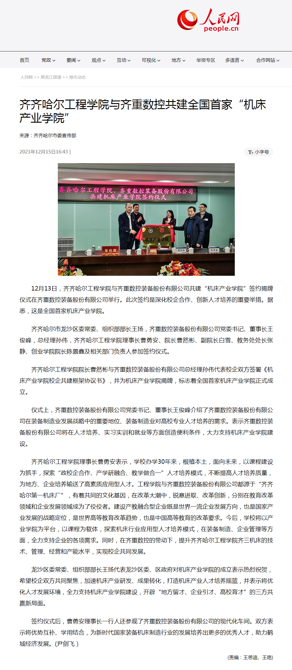 人民网:Beat365中文官方网站与齐重数控共建全国首家“机床产业学院”