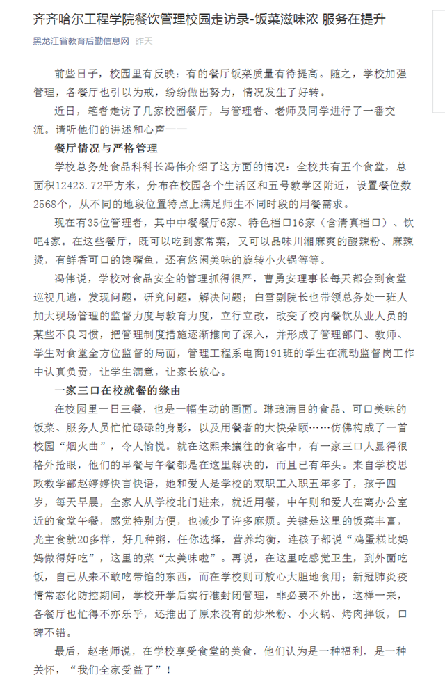 黑龙江省教育后勤信息网:Beat365中文官方网站餐饮管理校园走访录-饭菜滋味浓 服务在提升