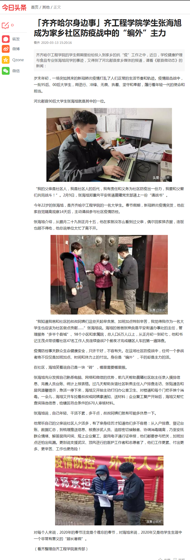 今日头条《齐齐哈尔身边事》:齐工程学院学生张海旭成为家乡社区防疫战中的“编外”主力