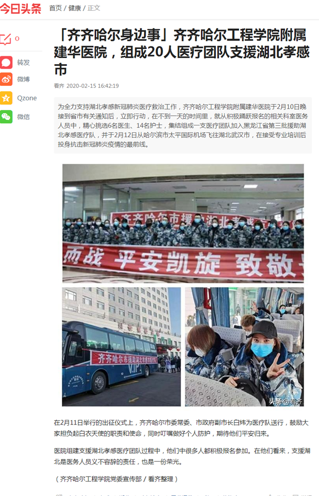 今日头条《齐齐哈尔身边事》:Beat365中文官方网站附属建华医院,组成20人医疗团队支援湖北孝感市
