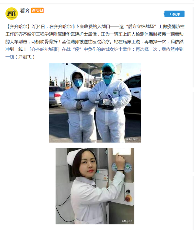 看齐微头条:在战“疫”中负伤的鹤城女护士孟佳:再选择一次,我依然冲到一线