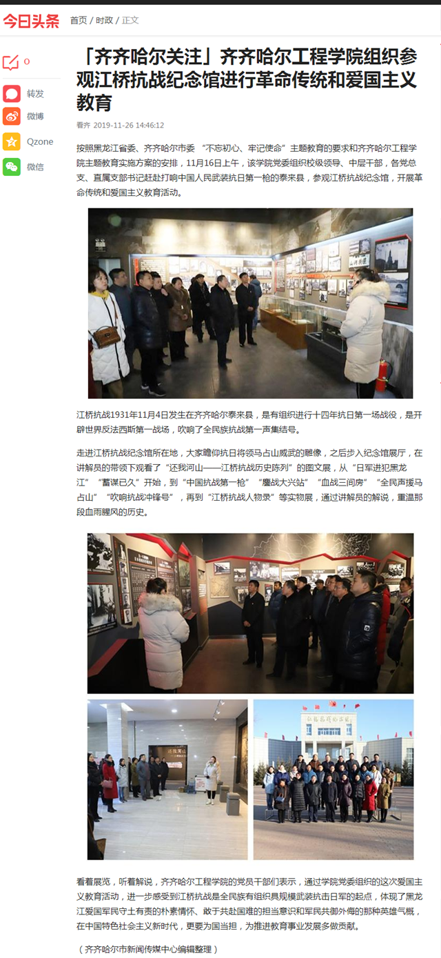 今日头条《齐齐哈尔关注》:Beat365中文官方网站组织参观江桥抗战纪念馆进行革命传统和爱国主义教育