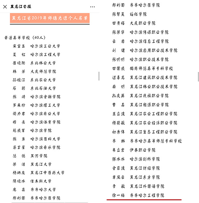 黑龙江日报微信公众号报道学院教师徐一楠荣获“黑龙江省2019年师德先进个人”称号
