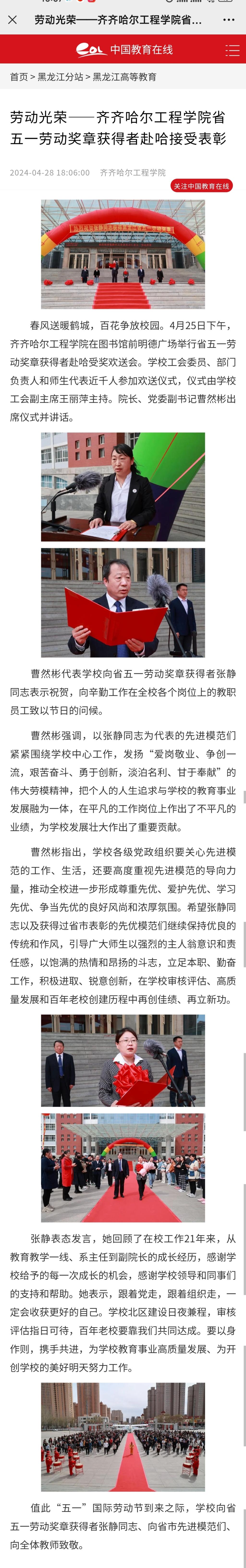 《中国教育在线》报道Beat365中文官方网站省五一劳动奖章获得者张静副院长赴哈接受表彰 劳动光荣