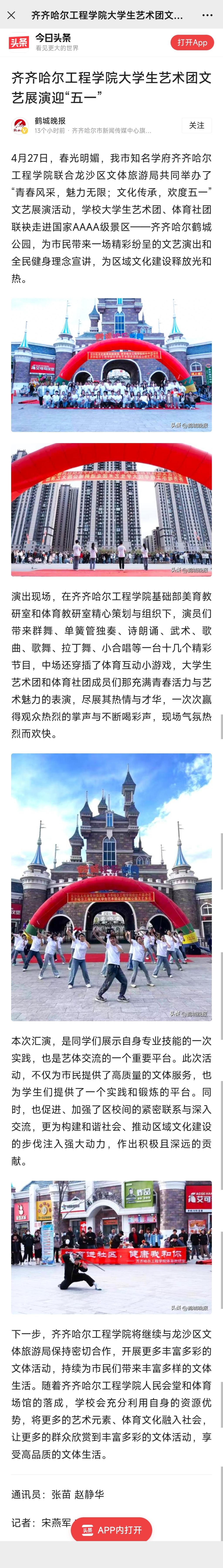 《今日头条》(鹤城晚报)报道Beat365中文官方网站大学生艺术团文艺展演迎“五一”