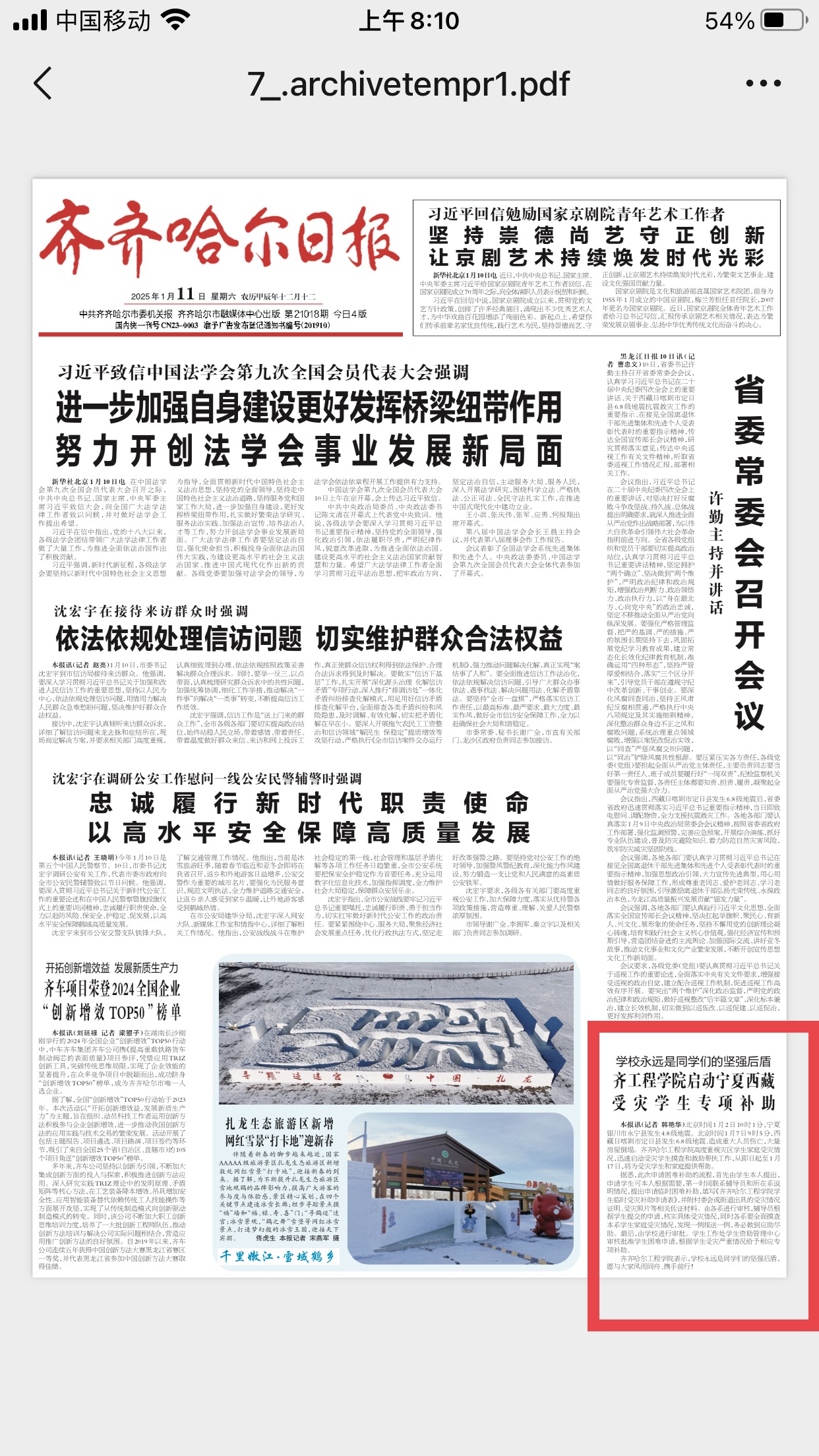 《齐齐哈尔日报》学校永远是同学们的坚强后盾 齐工程学院启动宁夏西藏受灾学生专项补助