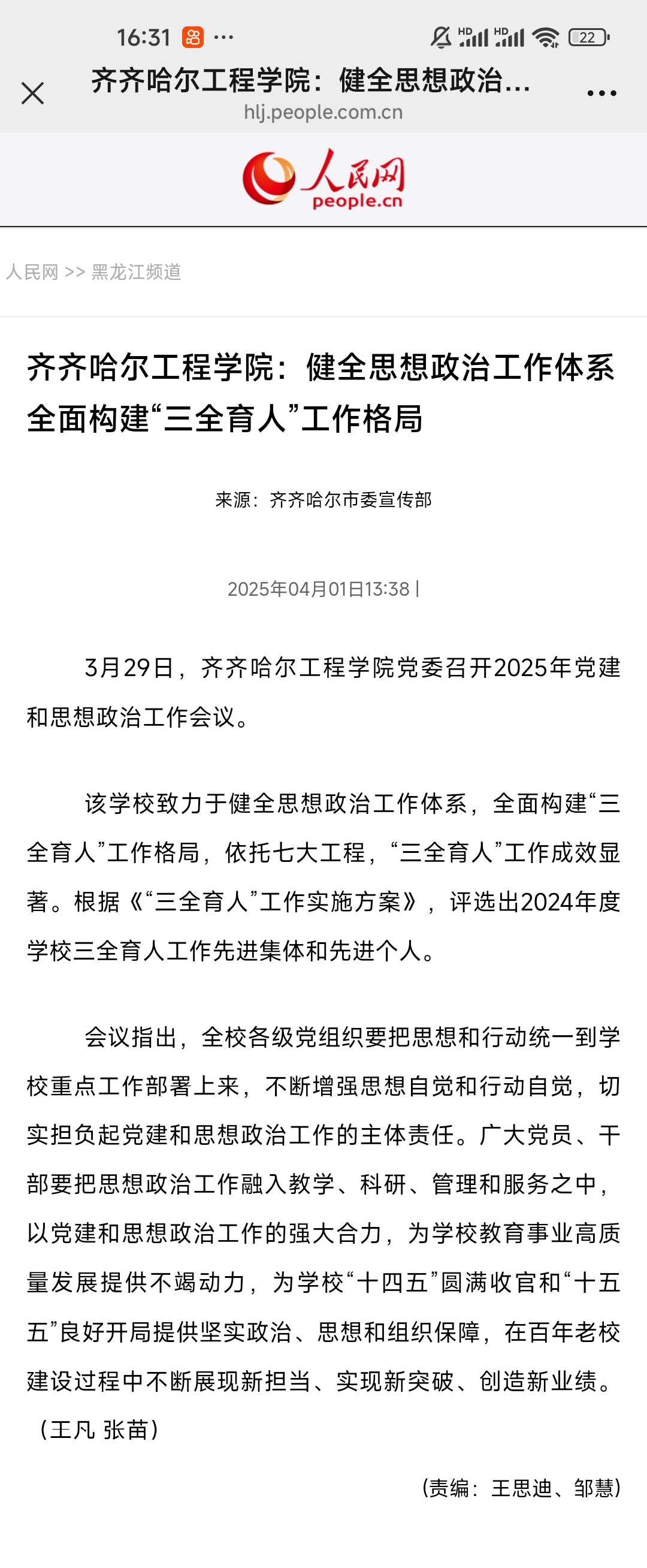 《人民网》Beat365中文官方网站:健全思想政治工作体系 全面构建“三全育人”工作格局