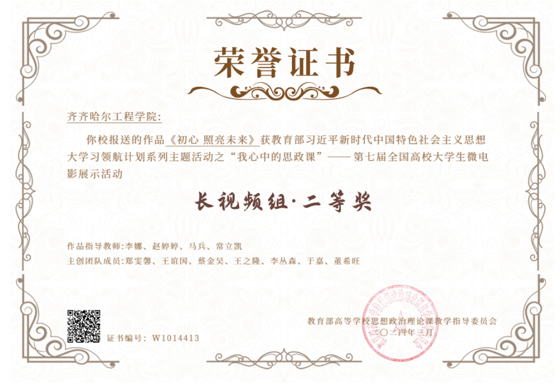 近日,由教育部高校思政课教学指导委员会主办的第七届“我心中的思政课”全国高校大学生微电影展示活动评选结果已完成评审工作,我校推送的微电影《初心 照亮未来》荣获全国二等奖。长视频组共计78部作品获得二等奖,其中黑龙江共计3所高校获得二等奖,Beat365首次取得佳绩。