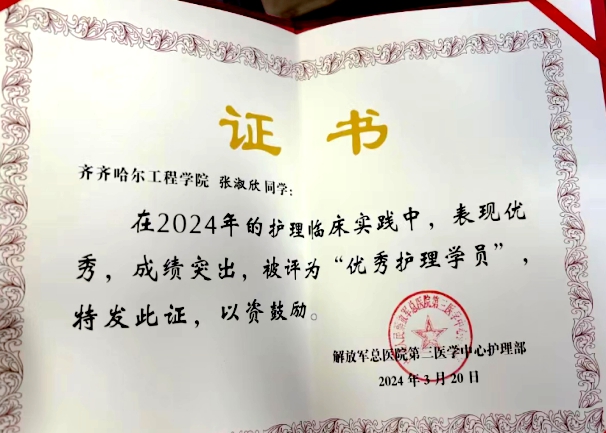 在中国人民解放军战略支援部队特色医学中心实习的护理学206班张泉灵、王子桐两名学生荣获“优秀实习生”荣誉称号。