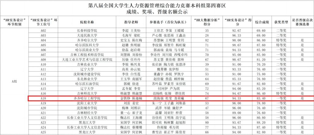 第八届全国大学生人力资源管理综合能力竞赛本科组第四赛区成绩单
