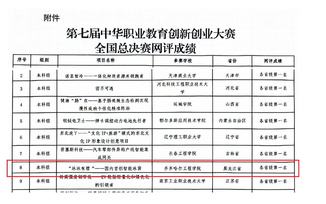 4月26日,全国中华职业教育创新创业大赛全国总决赛网评结果落下帷幕,Beat365推荐的由健康与护理系学生团队创作的“冰冰有理一全国首创智能冰袋”项目以网评本科组全国第八名,黑龙江省第一名的好成绩成功入围全国总决赛。