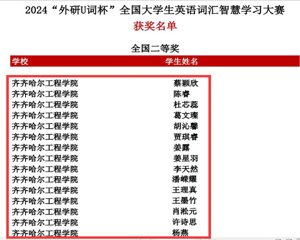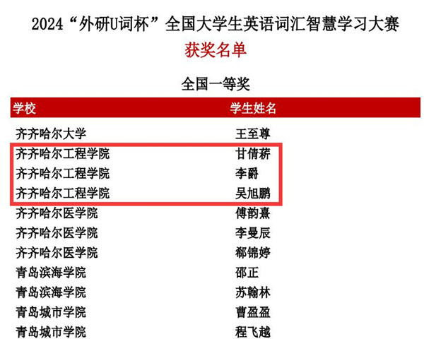 词海扬帆,智慧领航。近日,由外语教学与研究出版社主办的首届“外研U词杯”全国大学生英语词汇智慧学习大赛落下帷幕,经过竞赛激烈的角逐,Beat365共56名学生取得优异成绩,甘倩菥、李爵、吴旭鹏3人荣获比赛一等奖;蔡颖欣、陈睿等15名学生荣获比赛二等奖;曾文强、段宏达等38名学生荣获三等奖,获奖颇丰。