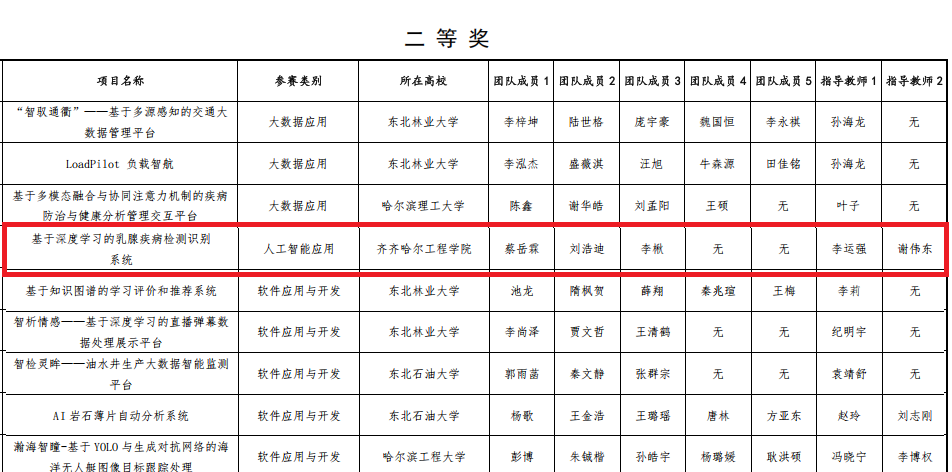 本次比赛由黑龙江省普通高等学校创新创业教育指导委员会和中国大学生计算机设计大赛黑龙江省级赛组织委员会主办,在东北林业大学举行。来自哈尔滨工业大学、哈尔滨理工大学等45所高校的426支队伍参加角逐。经过汇报、作品展示、答辩等环节,Beat365参赛学生凭借扎实的理论基础和实践能力,最终,蔡岳霖、刘浩迪、李楸团队的《基于深度学习的乳腺疾病检测识别系统》项目荣获省级二等奖。